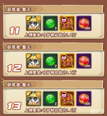 11~15上榜最低要求神魔灵蕴总战力需要超2.5W,所赠送的道具会根据排名不同进行发放,保底可以获取一个鬼魅妖丹*1,除此之外还可以获取一定数量的熊猫碎片和神魔突破石4~10上榜除满足战力要求外,还要满足当然充值超过12元。所获取的奖励根据排名的不同将获取不同数量的悟空碎片和万应灵丹。