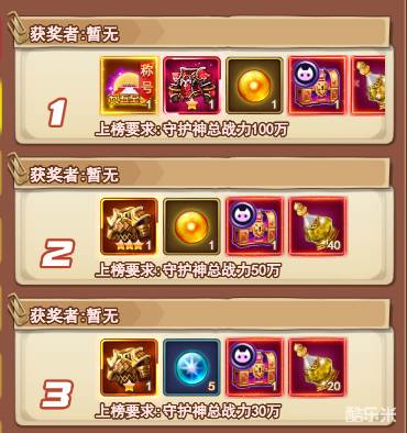第三名,守护神总战力最低需要超过30W,所获取的奖励为1星品质5的炽阳战甲、5个万应灵丹、神魔随机箱*1和20个涅槃圣药。第二名,守护神总战力最低需要超过50W,所获取的奖励为3星品质5的炽阳战甲、1个大能金丹、神魔随机箱*1和40个涅槃圣药。第一名,守护神总战力最低需要超过100W,所获取的奖励为1星品质6的祖龙战甲、1个大能金丹、神魔随机箱*1和80个涅槃圣药。
