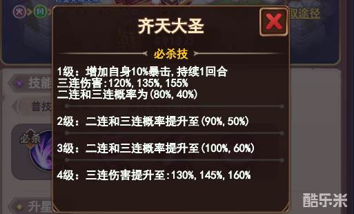 从定位上来说悟空属于刺客,其普攻属于单体技能。其必杀技齐天大圣属于增益技能,1级释放的时候可以增加自身10%暴击,持续1回合,除此之外还会有概率触发连击效果,触发后对单个目标造成二连或者三连伤害,伤害系数会随着技能等级的提高而提高。