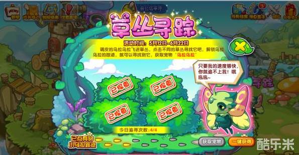 1.洛克王国草丛寻踪活动很简单,每日有四次机会在四个草丛中寻找乌拉乌拉,点击可能会找到不明宠物的踪迹,从而触发挑战。