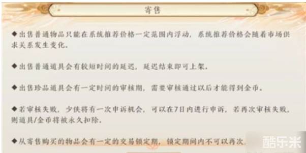 如果是珍品那么可以自由定价,这一类型主要是高阶装备和稀有道具等,出售市场非常广阔,很多在游戏中平民玩家都是依靠获得珍品来收集足够多货币发展战力。无论是普通或是珍品,都需要在出售中选定好价格以及出售数量后,就能直接上架成功。如果是珍品则需要先进行审核,然后再公示,普通没有这些麻烦,审核失败还能向客服提出申诉。