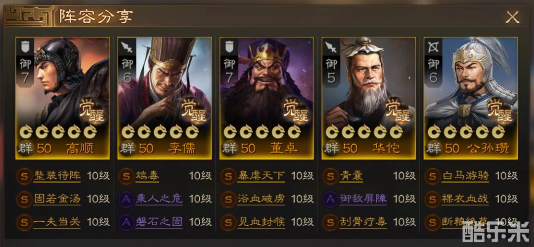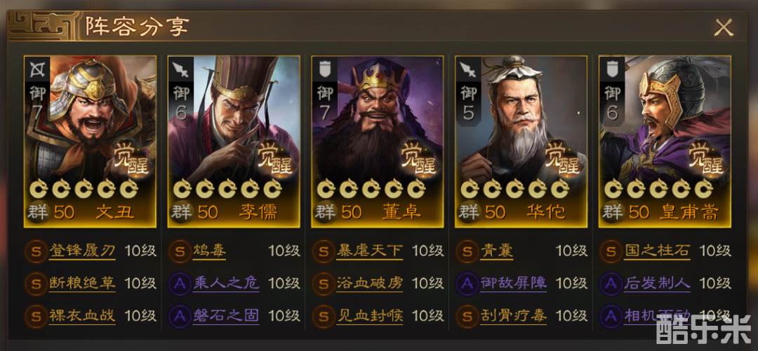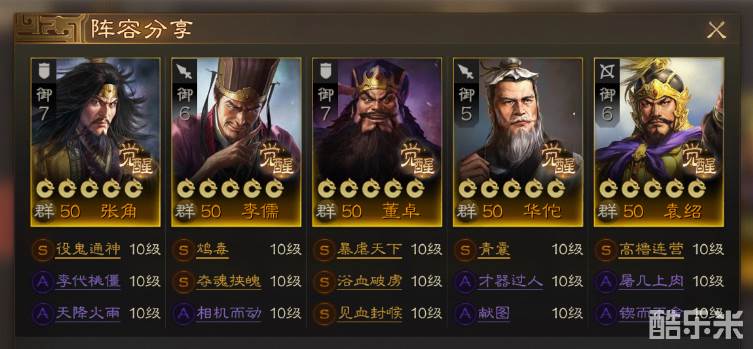 这个阵容的关键在于 董卓、李儒 的毒伤害,还有华佗的群体强力治疗提供续航,其他武将是可以替换的。