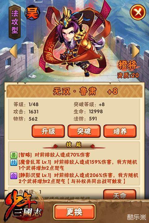 鲁肃与孙权是吴国好基友一对,其技能也是出奇的相似,均为打前排,合击技能【静影沉璧】对敌方前排造成206%的伤害,同时回复我方2个武将的2点怒气,加之释放合击后孙权再释放大招,满屏和谐,小编简直不忍看对方的前排!