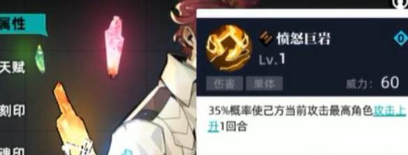 该角色在定位上是一个增益性辅助,1技能愤怒巨石可以为我方队友提高攻击属性,不过这个概率比较随机,如果能提升该等级的技能,那么概率和回合数都能得到提升。