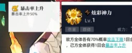 大招炫彩神力是一个范围性的伤害,伤害一般,但提供的效果是比较厉害,有百分之70的概率可以降低敌方团队的攻击力,还可以提供我方额外的暴击属性,对于团队贡献很大。
