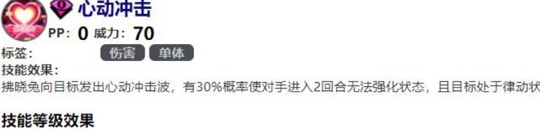 这个技能是四星角色拂晓兔的一技能,威力70并且不消耗pp值,通过向对手打出一道冲击波从而有40%的概率让敌方在2回合内没有办法进行强化,如果对手处于拂晓兔的专属debuff律动状态下,禁强的概率能够达到70%,是一个非常霸道的技能。