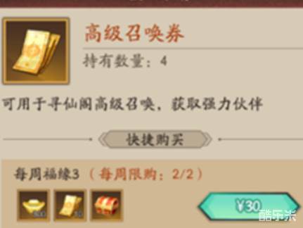 首先是高级召唤券,这个召唤券需要在寻仙阁内使用,除了天月之外还能够获得很多其他的角色,具体的获得途径就是每日的优惠以及游戏内的试炼之境,想要快速获得的小伙伴也可以购买福缘哦。