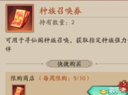 第二个就是种族召唤券,这一个召唤券可以在高级召唤券的基础上指定想要获得的种族来进行召唤,而且获取的途径也比较多,积分商店、幻境、限购商店、每周福缘,想要获得天月的大家千万不能错过每周的福缘袋哦。