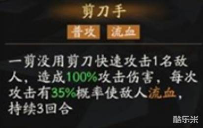 有敌方减益、有友方增益、还有不错的输出能力,说的就是一剪没,战法:恶鬼剪,施展之后一剪没会使用手中的剪刀攻击敌方全体目标三次,每一次都可以造成40%的伤害而且还会有16%的机率为敌方增加流血buff,并持续3个回合。