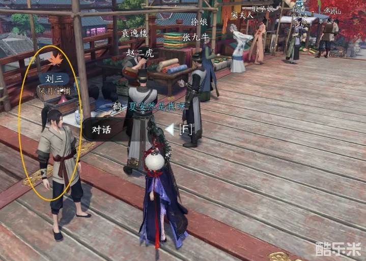 1、一开始在虹桥上找到NPC刘三,和他交谈,不用买东西,一直点【不了不了】也能触发。