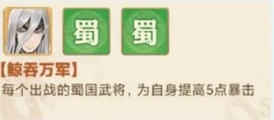 魏延自身战阵连携提供高额的暴击,还有全程的反骨效果提升。可以带来不俗的输出效果,尤其是蜀国阵容上阵一个治疗的情况下,魏延很大程度弥补了伤害的短板。