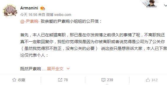 既然尹素婉小姐姐选择发这条微博,那我就觉得我也没啥必要留情面,就把所有事情的真相给大家还原一下吧!(一会儿,有哪位懂得大哥告诉我一下,这应该不属于泄露公司机密吧?)我就按你发微博的顺序一段一段回复吧!