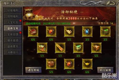 在活动期间,全服挖掘次数达到2888次必将获得大量奖励!通过挖掘秘境,您将有机会获得珍稀装备、稀有材料和大量资源,助您在游戏中更加强大!