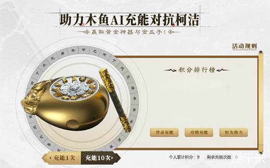 通过图中三种方式参与充能,即可获得“充能积分”,消耗充能积分可参与抽奖,赢取999纯金定制款黄金瓜子、柯洁签名照、50元京东卡等奖励!根据玩家的累积充能积分,积分排行榜第2-20名可以获得金瓜子奖励,最终排名首位的玩家将可获得价值超5万元的黄金木鱼大奖!本次活动中,所有黄金实物奖品均有权威机构认证证书!