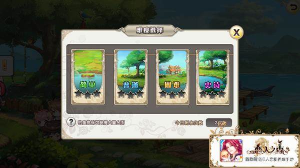 钓鱼地点就隐藏在庄园中,进入庄园后,右侧清澈的河流静静流淌,河边的码头旁,静静的停泊着一只小船,这支线船将会带你前往钓鱼地点!点开钓鱼界面,有四个选项会酌情开放,普通、一般、困难、史诗四个难度逐渐递增,循序渐进挑战是最好的选择,每天有两次挑战机会,赶紧来试试吧!