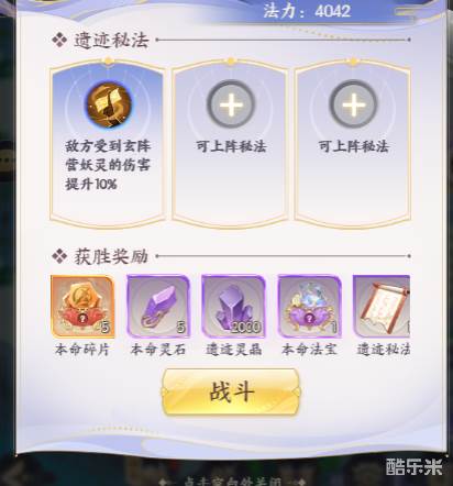 进入玩法后玩家可以选择挑战的敌人,战胜后即可获取奖励与遗迹秘法,期间会刷新出遗迹宝树,可购买本命法宝碎片等商品