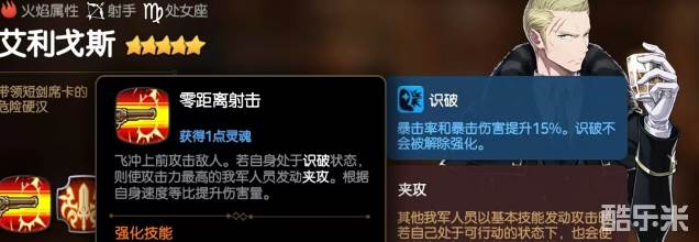 第1个技能零距离射击,飞冲向前攻击敌人,如果此时自身已处于识破状态,则能携带另外一名我方攻击力最高的人员发动夹攻。识破状态是该角色自身其他技能所附加的效果,在此状态下能提升15%,暴击率和暴击伤害是非常出色的增益属性。此技能还有一项特点,是能根据自身速度按照比例提升伤害量。