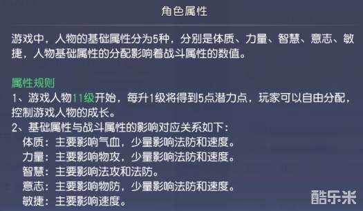 角色的属性一共分为五种体质、力量、智慧、意志、敏捷每种属性都会影响角色的属性数值,也可以通过洗点或后续升级加点改变角色的属性重心,自由选择角色的成长方向(新手建议根据角色本身的定位进行加点哦)