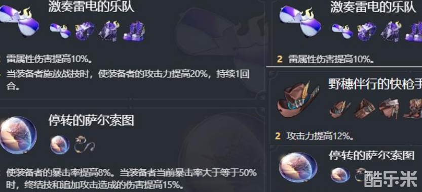 3、景元的遗器套装还可以选择【激奏雷电的乐队】、【野穗伴行额快枪手】和【停转的萨尔索图】的二加二加二组合,作为景元的过渡遗器组合。