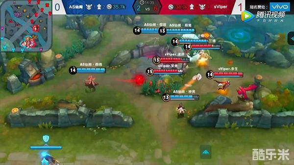 14分35秒,在敌方确认的情况下杨戬配合队友强行开团,杨戬采取正面突进帮助队伍吸引火力,并不断提供AOE输出,让中路的不知火舞可以从侧面切入,最后等李白赶到战场时AS仙阁已经收掉了敌方的前排,杨戬选择再次突进牺牲自己留住敌方二人,配合队友赢得了团战的胜利。