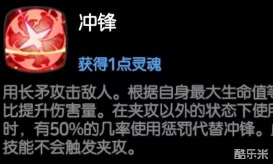 第1个技能冲锋,使用之后用长矛攻击敌人,根据当前自身最大生命值提升伤害量,比较单纯技能,强化之后也只能获得伤害量上的提升,并没有其他附加。但是如果是夹攻以外状态使用,有百分之五十几率替换成为惩罚。惩罚是该角色第2个技能,用刺击攻击敌人,在命中之后还能造成相当于附带伤口效果50%的额外伤害。自身最大生命值越高,伤害量也就越多,每使用一次该技能可以降低目标最大生命值的20%,在灵魂燃烧之后伤害量还能进一步提升。