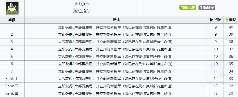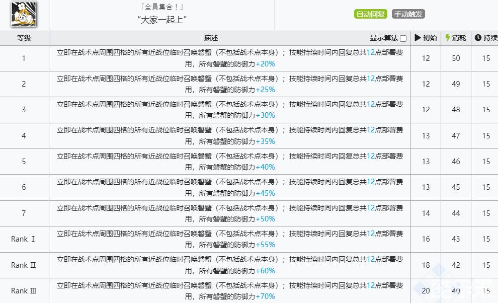 开启技能后会立刻获得8点部署费用,并且会立即刷新磐蟹。