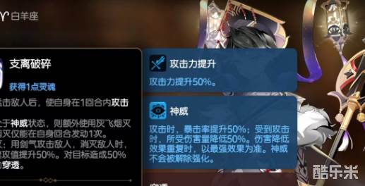 神威状态是极其有效的伤害提升效果,在攻击时暴击率提升50%,受到攻击时所承受伤害量降低50%,这样既有输出又有防御。而且是自身技能俯首称臣所能附加的状态,俯首称臣在攻击之后除了解除两个强化效果之外,还能造成一回合沉默,以及速攻值降低等影响,自身在三回合内获得神威效果。当消耗10点灵魂开启灵魂燃烧效果后,能够将目标身上所有强化全部解除,相当于直接将目标一切附加状态全部清零,这在很多战斗中都是非常有效的净化类作用。