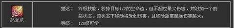 120级技能怒龙爪需要怒气值直接杀怪和人(不能打boss)2/3的血,说是刀客绝招可是我觉得基本上是废的。3秒吟唱还是近身技能,应该是配合控制陷阱一起使用的。只要控制住基本上对方都是死了,用不着来秒个2/3浪费怒气,除了甲士,打别的职业3秒应该也能掉2/3的血了。