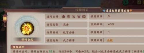 马超的技能骠骑奋起属于突击型技能,攻击时触发后能提升自身15点武力持续2个回合。然后对敌方全体造成武力伤害,提升技能等级能造成更多的伤害。
