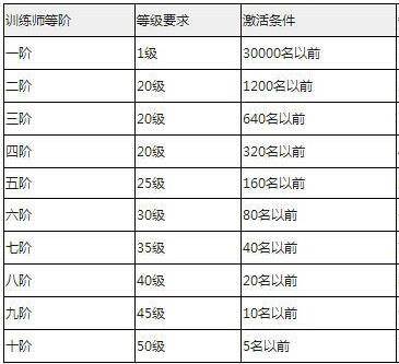 比如,要进阶到二阶训练师的话,需要玩家达到20级,并且在竞技场中排在1200名以前才行。每一阶的晋升要求都不一样,详情如下: