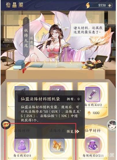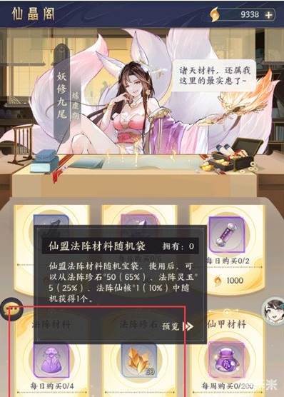 此外,道友们可以每天在仙晶阁中购买法阵珍石和法阵材料随机袋,但价格相对较贵,大家酌情购买。
