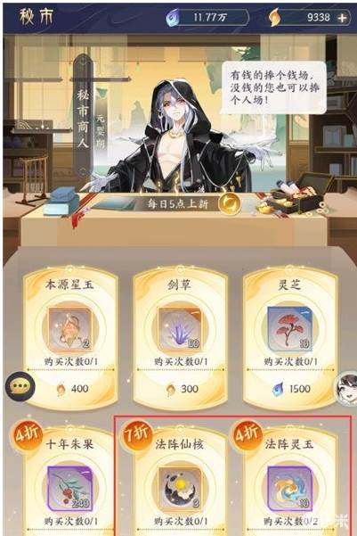 相较于仙晶阁,在秘市中刷出法阵仙核和法阵灵玉更加划算,运气不错的话还可以打折购买,十分推荐每日必刷,打折必买。