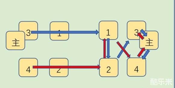 如上图所示:1、3号位和主角出手,进攻敌方单位顺序>1>2>3>主角>4;