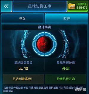 在星球信息视图中还可以查看星球现在的防御护盾信息。但如果要开启护盾或增加护盾等级,需要指挥官移步“星球防御工事”。