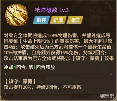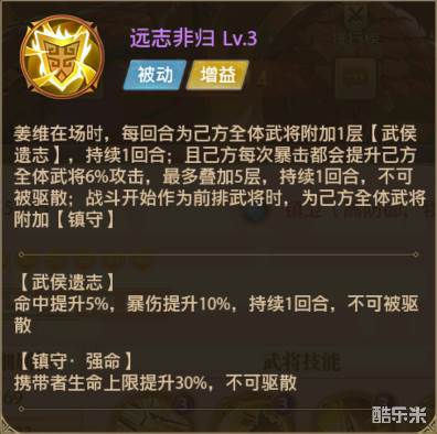 神姜维:枪阵破敌、远志非归。提升大量的攻击,使己方武将的攻击提升到最高。
