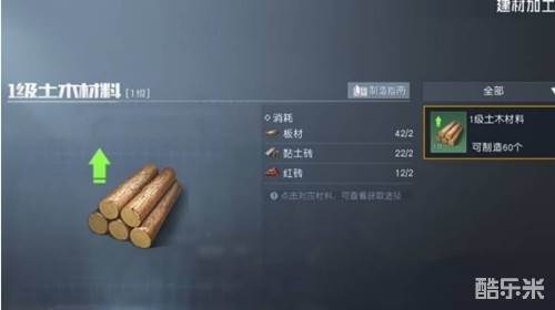 对于一级土木材料而言,需要耗费的半成品有板材、红砖和黏土砖。其中,板材所要用到的原材料为木头和强力胶,红砖用到的原材料有石头和水泥,而黏土砖用到的原材料为石头和黏土,这几种原材料分别可通过采集和商人处购买获得。
