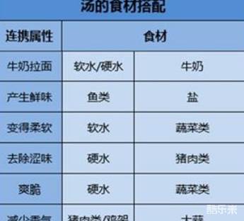 在小伙伴们搭配熬煮汤汁的时候,合适的食材放在一起熬煮就会产生相性,相性会提高食材的属性。小伙伴们可以使用的食材分别为猪肉、鱼、蔬菜,调味类的有酒、油、味噌以及辣椒。同样的和上面一样,小伙伴们看图片会更加明朗。