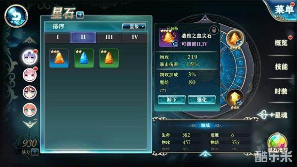 成功激活二阶星魂后,可以获得4个星石孔位,点击任意孔位就可以呼出背包装备星石啦。Ⅰ号位可以装备代表血量的琥珀石,Ⅱ号位可以装备代表攻击的血尖石(物攻)或苍瞳石(魔攻),Ⅲ号位可以装备代表防御的鳞甲石(物防)或碧榄石(魔防),Ⅳ号位则是可以装备所有种类的星石其中也包括Ⅳ号位专属星石,提升角色速度的辉耀石。
