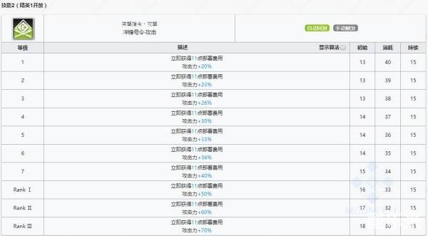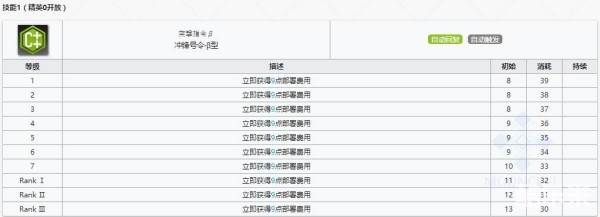 开启技能之后立即获得11点部署费用,并且在一定时间内会使自身的攻击力得到提升。