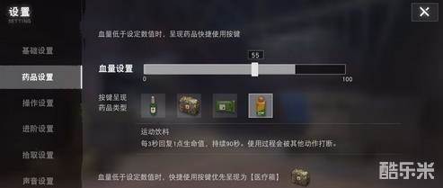 可以发现所有的药品都会被其他动作打断,所以千万不要在使用药品的时候再走动或者按其他的按键!同时在设置中可以在设置使用药品快捷键出现的血量以及呈现医疗箱时候的血量。这样也大大方便我们针对性的选择药品,不至于浪费