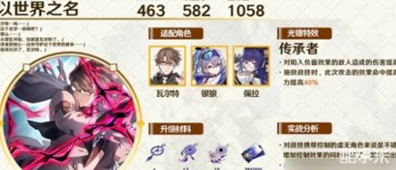 除专武之外,瓦尔特专武【以世界之名】也有效果命中不太够的问题,相对来说还是更适合2魂后的银狼来作为除专武外最好的选择,当然对于0命银狼来讲,不如活动送的光锥好用。