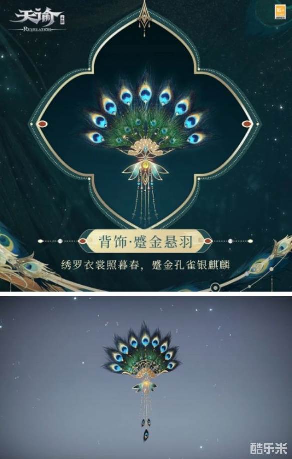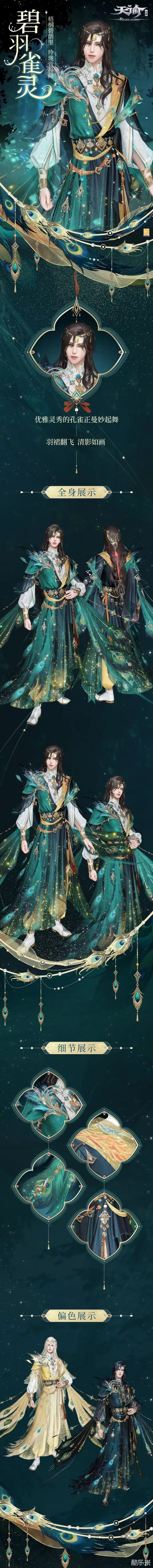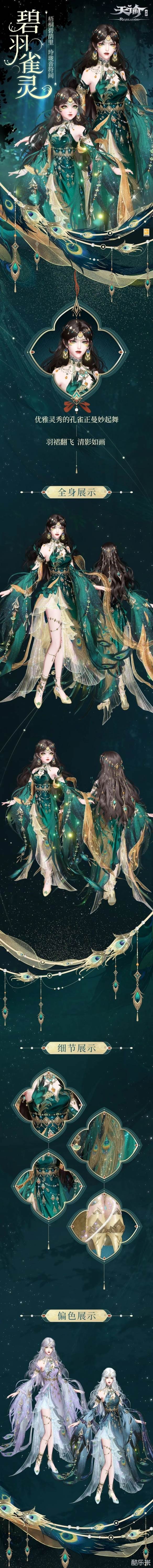 梧桐碧荫里,玲珑音符间,优雅灵秀的孔雀正曼妙起舞, 羽裙翻飞,清影如画。——全新时装“碧羽雀灵”上线。