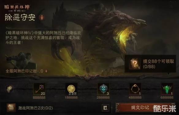 活动时间为6月8日3:00至6月22日2:59,冒险者们首次战胜阿煞巴能获得大地珍珠、噬月材料、噬月之尘和大量金币奖励!如果成功完成除恶守安和激战阿煞巴挑战,提交阿煞巴印记还能解锁里程奖励,获得包含珍稀联动传奇宝石【莉莉丝的哀叹】、限定头像框等丰厚奖励!当个人提交印记达到88个时,还能收获一件随机传奇装备!