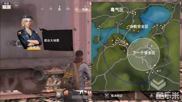 蓝色范围为毒气区,白色区域为安全区,玩家需要不断的移动,到达安全区域从而获得比赛的胜利。
