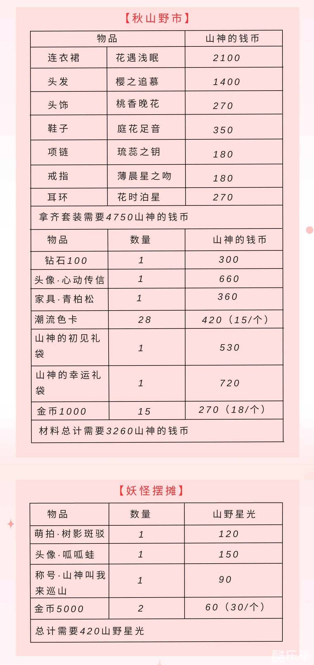 山神的钱币可以在秋山野市兑换下列奖励: