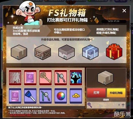 升级礼物箱可获得更好的礼物,但是也可能升级失败。升级失败时,保留原本的礼物箱等级。打开礼物箱后即可获得礼物,礼物箱变回第一阶段。