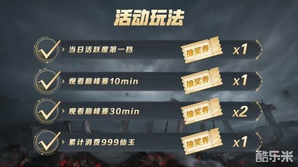 参与活动只需要完成活跃度、观赛和仙玉消费等观赛任务,每日便可最多获得5张抽奖券!投入的抽奖券越多,获奖概率越高!