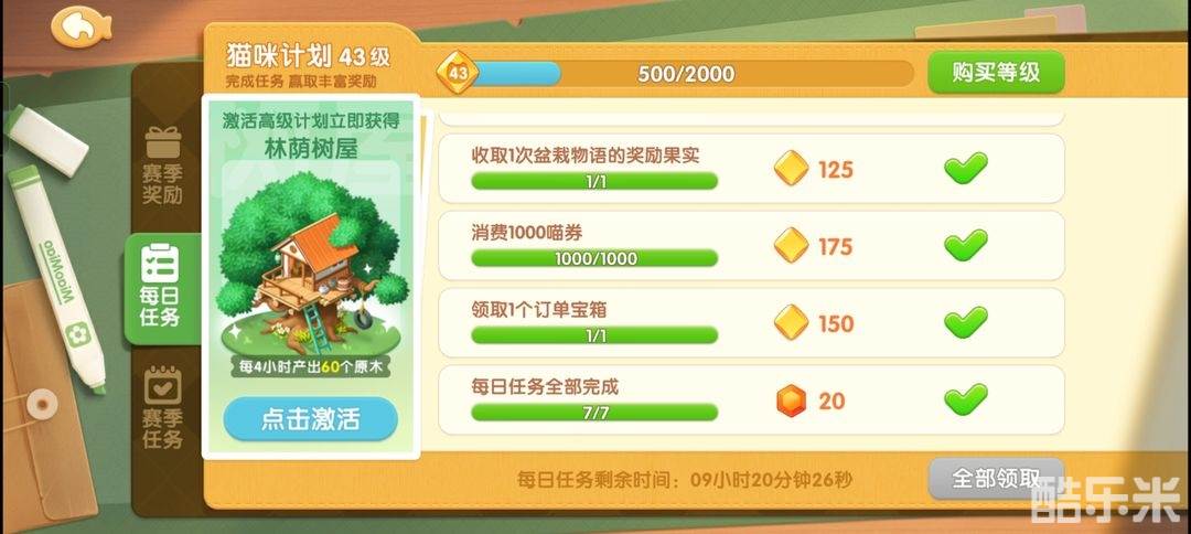 2、猫咪计划每日任务全部完成可获得20个