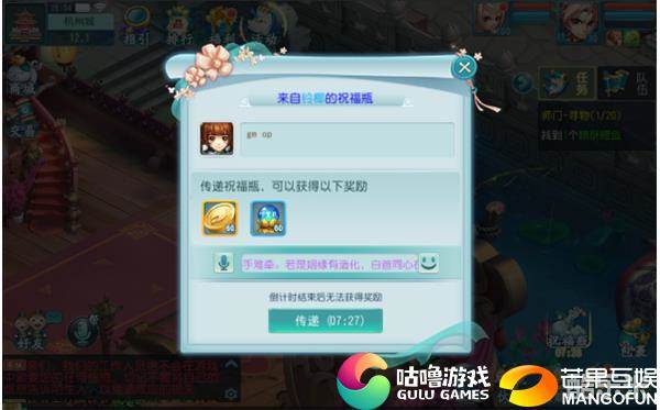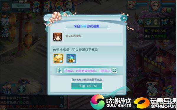 到达活动时间,系统会抽取随机的一定量玩家投放祝福瓶。玩家收到后,可编辑文字或语音在将祝福瓶传递出去,当玩家成功传递了祝福瓶后可以获得奖励。