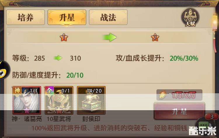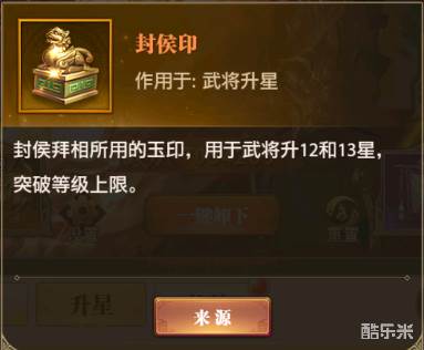 当主公等级达到105级或世界等级95级时,升星一个十二星武将需20个封侯印与一个六星本体、十星任意阵容武将。